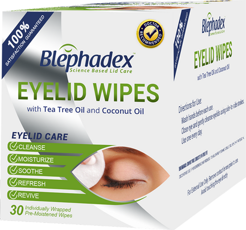 Yet, consistent eyelid hygiene is often an overlooked part of their daily routine. Keeping your eyelids clean is easier with Blephadex® Wipes. This soothing combination makes it simple to cleanse and gently massage your eyelids. Blephadex® Wipes are pre-moistened cleansing pads formulated with tea tree oil and coconut oil designed to gently clean the eyelid margins, lashes, and surrounding skin. These ingredients provide anti-microbial, anti-inflammatory, and soothing effects when used regularly. Tea tree oil targets organisms like Demodex mites, which can contribute to Blepharitis and irritation, while coconut oil helps moisturize and sooth delicate eyelid skin—all in one easy step. Clinical benefits include improving comfort & dryness symptoms, cleaning and removing debris (e.g. oils, crusting, collarettes, makeup), and supporting ongoing management of Blepharitis/Meibomian Gland Dysfunction and Ocular Surface Disease.